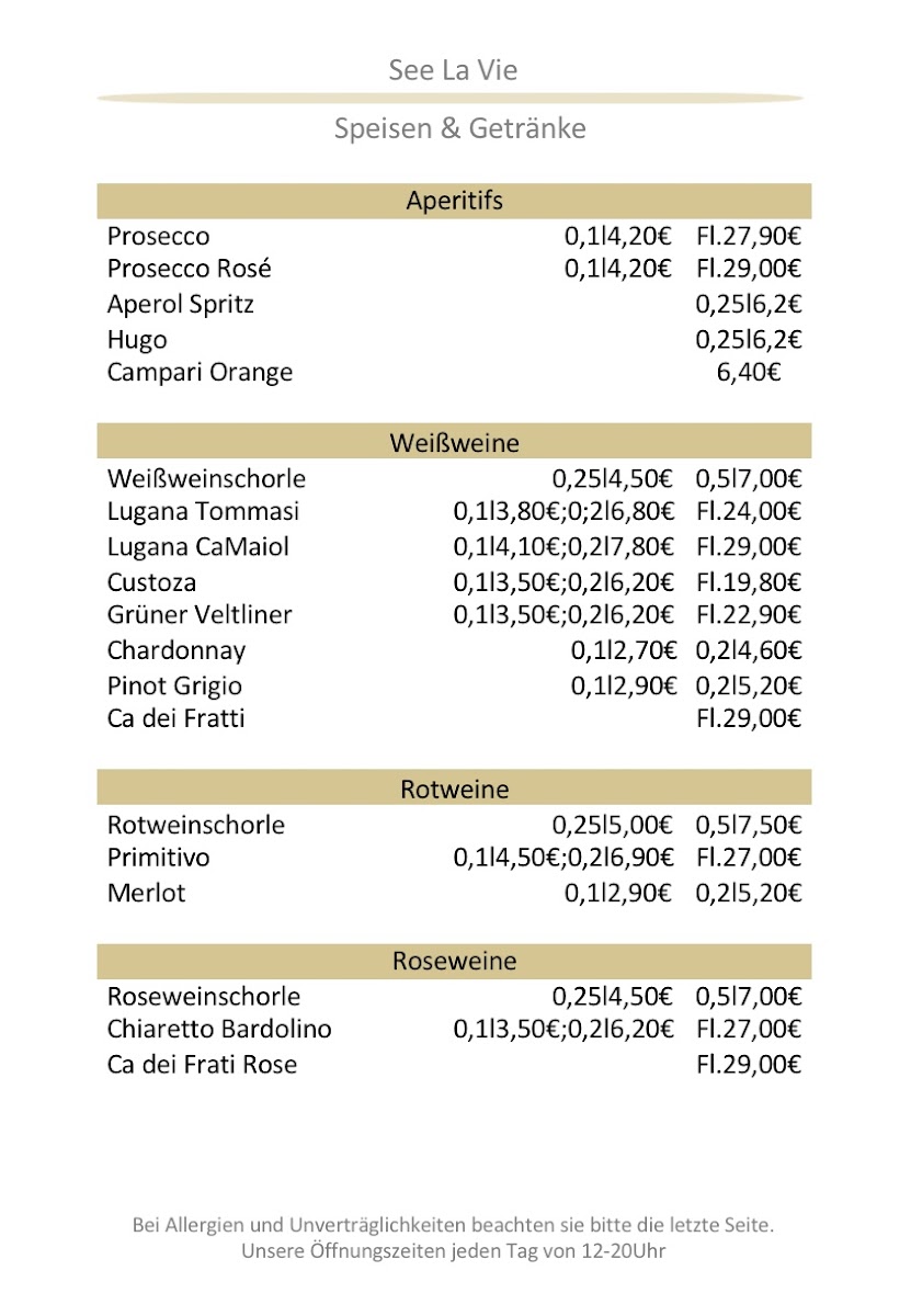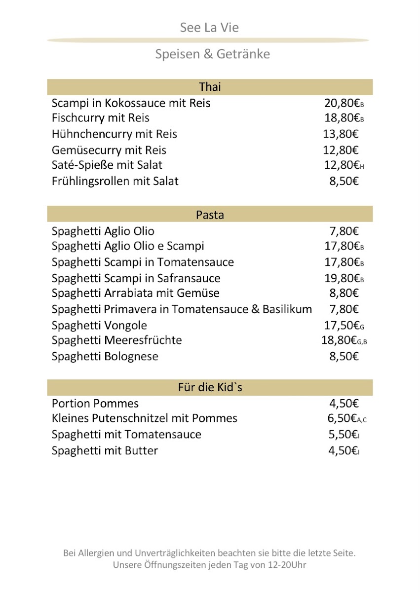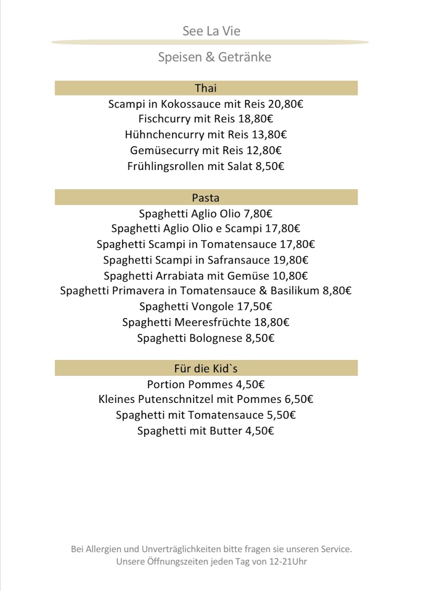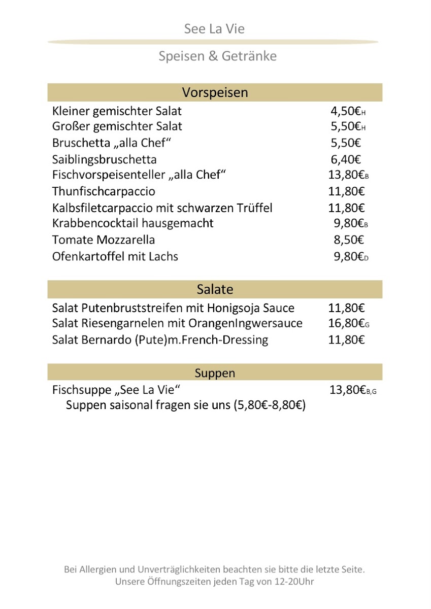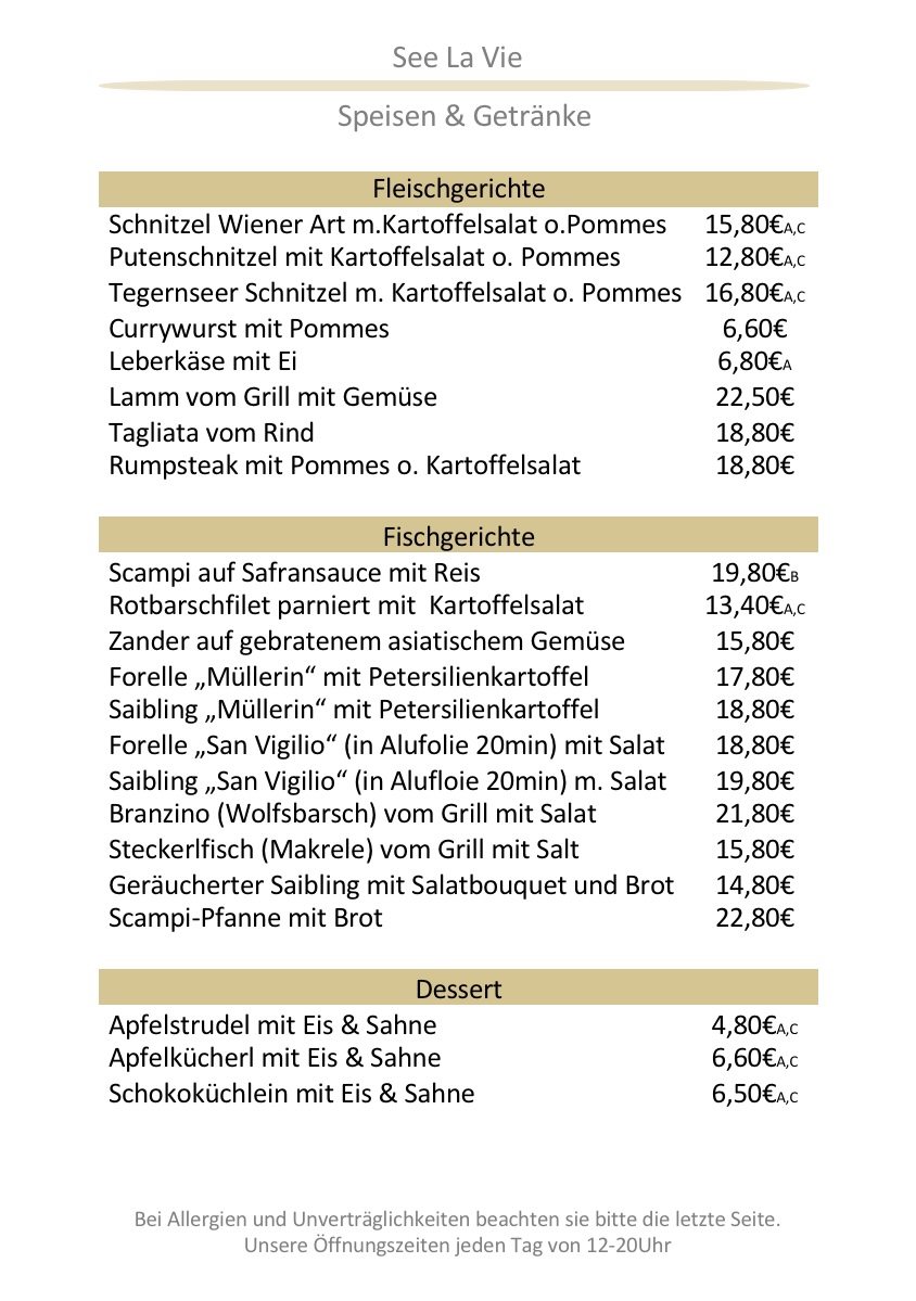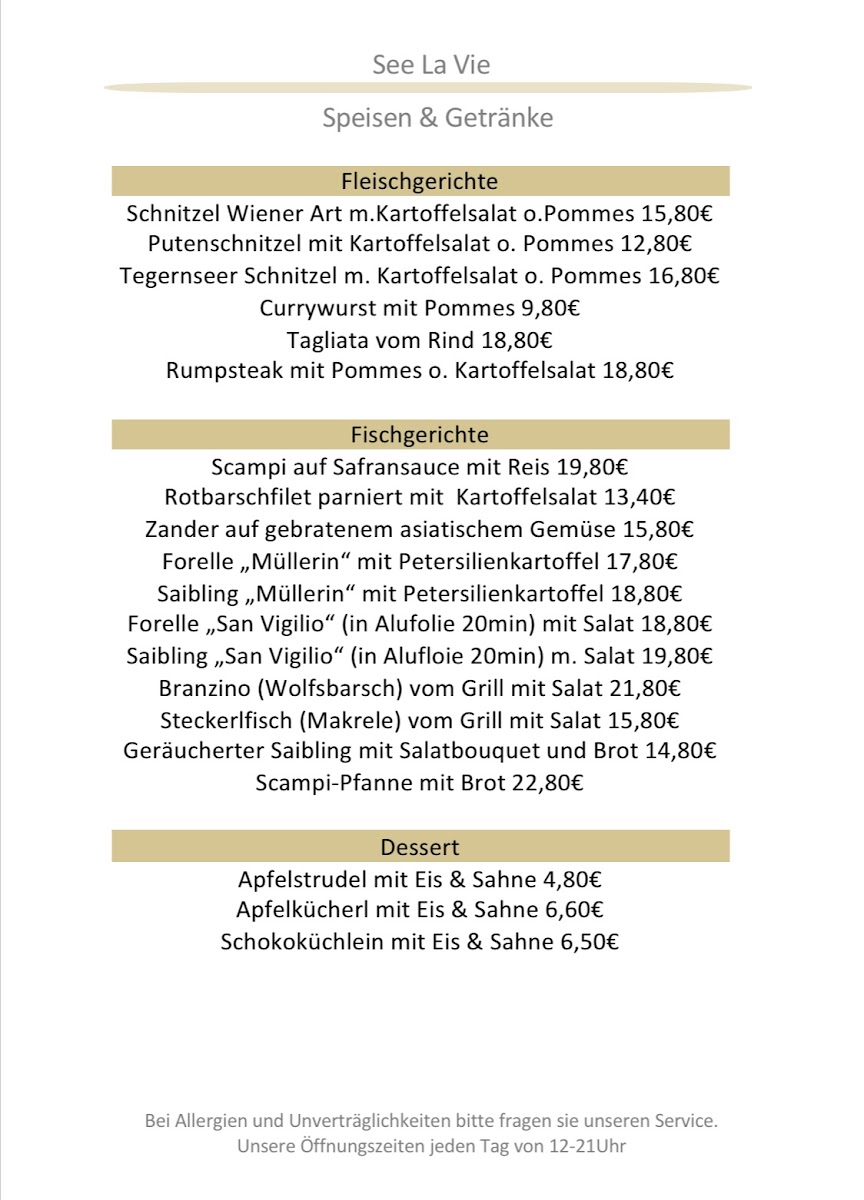 The menu at See La Vie Fischrestaurant reflects a clear focus on fresh seafood balanced with classic Alpine comfort, and as a reviewer, the overall impression is one of thoughtful variety rather than excess. The fish selection is the true backbone of the kitchen, with dishes like Saibling, Sea Bass, Mackerel, Zanderfilet, Branzino, and Zander Auf Asiatischen Gemüsebett showcasing different cooking styles while staying true to clean, natural flavors. Cold starters such as Salmon Carpaccio and Rinder Carpaccio are presented with elegance, while the generous Fischvorspeisenplatte Für 2 Personen works well as a shared introduction to the restaurant’s seafood philosophy. For guests seeking heartier plates, Roast Beef, Tegernseer Schnitzel Wiener Art, and the aromatic Fischcurry provide satisfying alternatives without straying from the menu’s cohesive identity. Seafood lovers will appreciate the depth found in dishes like Scampi-pfanne and the classic Bouillabaisse, which feel comforting yet refined. Lighter bites such as Bruschetta help round out the menu, especially when paired with a chilled Beer, Helles Bier, or a refreshing Aperol Spritz. The dessert selection, though concise, leaves a strong final impression, with Kaiserschmarrn delivering traditional sweetness and Warmer Schokokuchen offering a richer, indulgent contrast. Taken as a whole, the menu feels carefully curated, combining regional influences with Mediterranean and international touches, and it succeeds in giving diners a well-rounded picture of the restaurant’s culinary direction through every course.